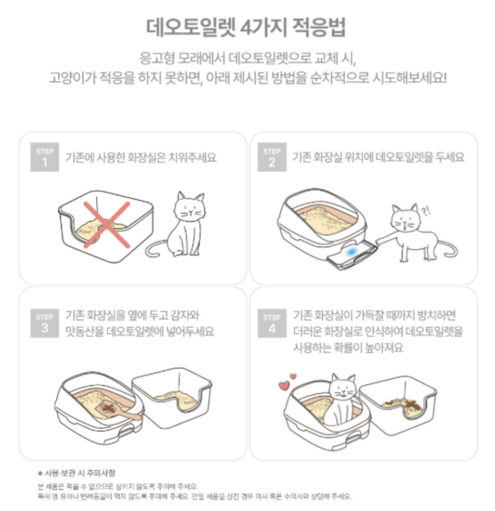 – 데오토일렛은 소변이 하단 시트 부분으로 소변이 떨어지는 구조로 전용 모래를 사용하지 않는 경우, 제품의 제대로 된 효과를 볼 수 없습니다.