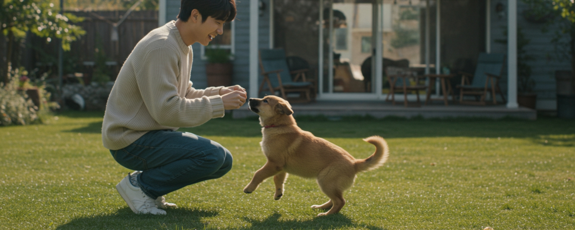 반복하여 강아지의 흥미를 유발해 보세요. - 강아지가 쫓기 시작하면, 잡히기 직전에 크게 움직여서 사냥 본능에 자극을 주세요.